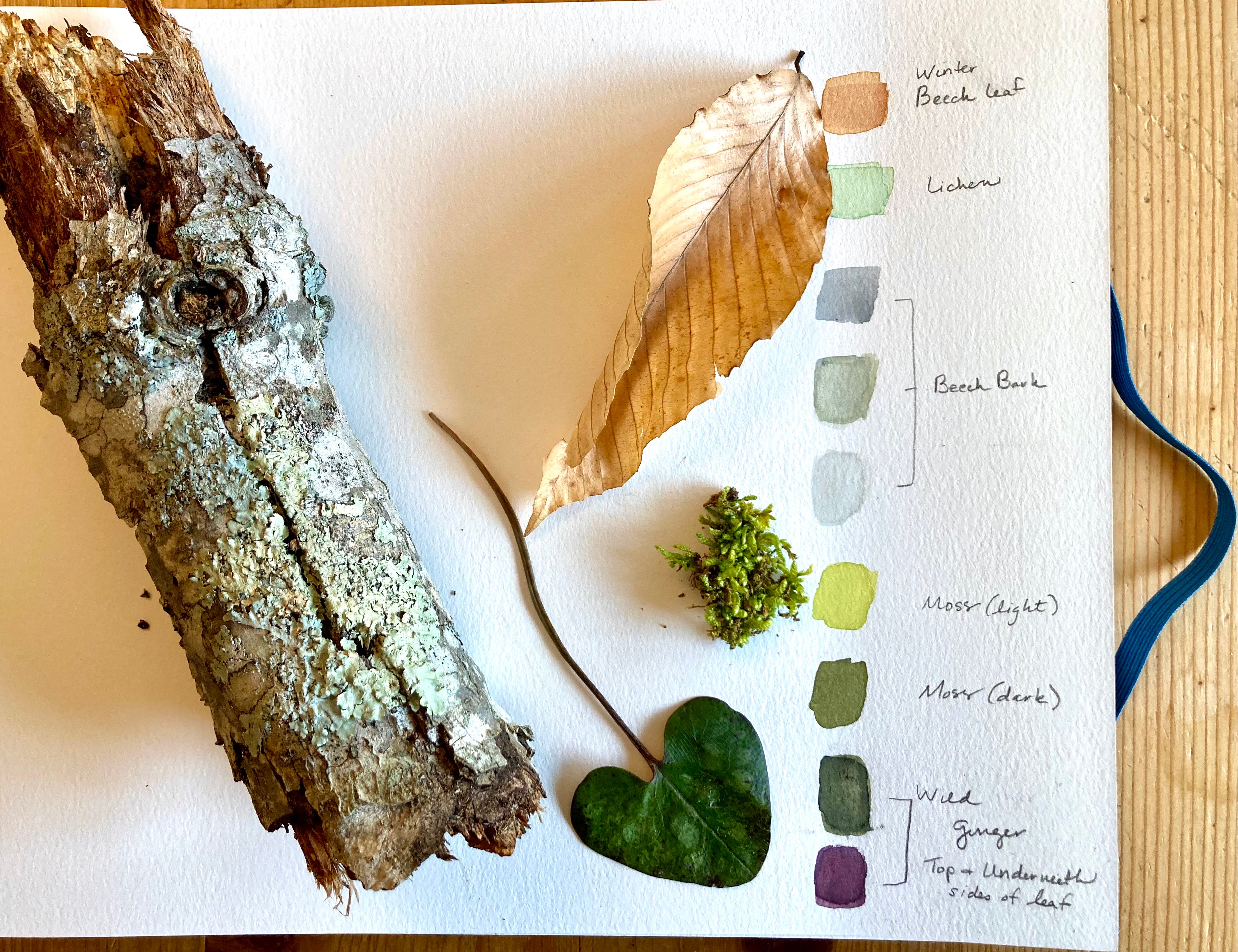 One way I find gentle relief is to go for a hike and just gather a few specimens of different colors. I choose things I like: a leaf, an interesting lichen-covered twig, a little moss. Whatever catches my eye. Back at home, I spend a few minutes with my simple watercolors and try to mix colors to replicate the day’s palette. It doesn’t have to be perfect by any means.