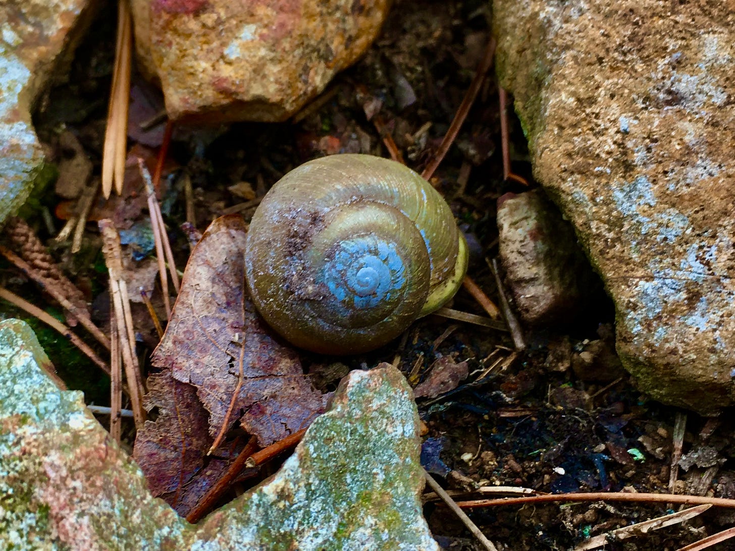 Snail curled deep in their spiral bedroom,
